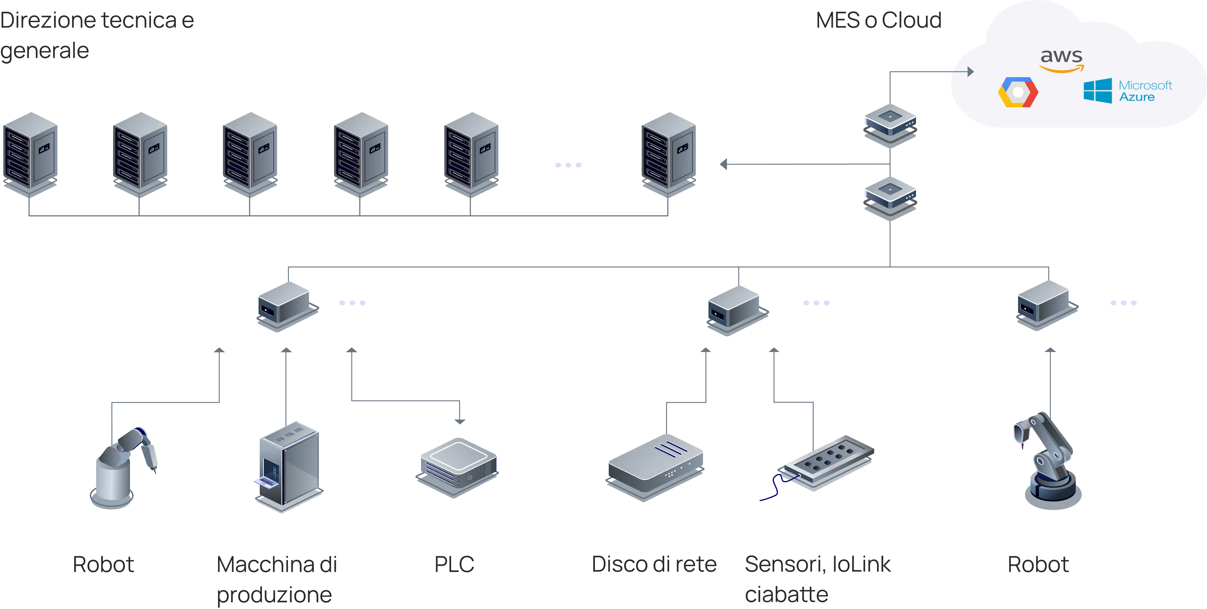 Il sistema acquisisce dati eterogenei dallo shop floor, cioè da macchinari, sensori e PLC, e li trasmette a sistemi superiori come MRP, MES o Cloud per analisi e reportistica avanzata.